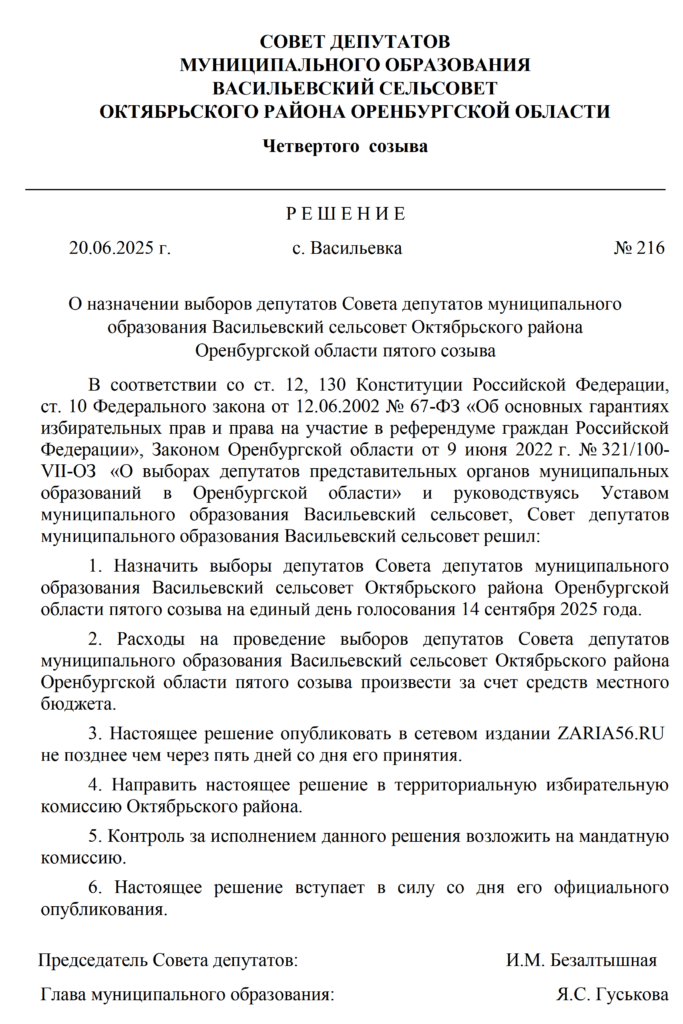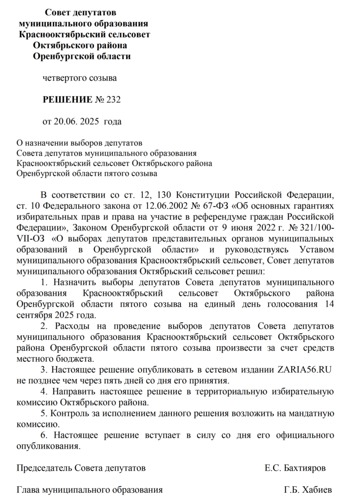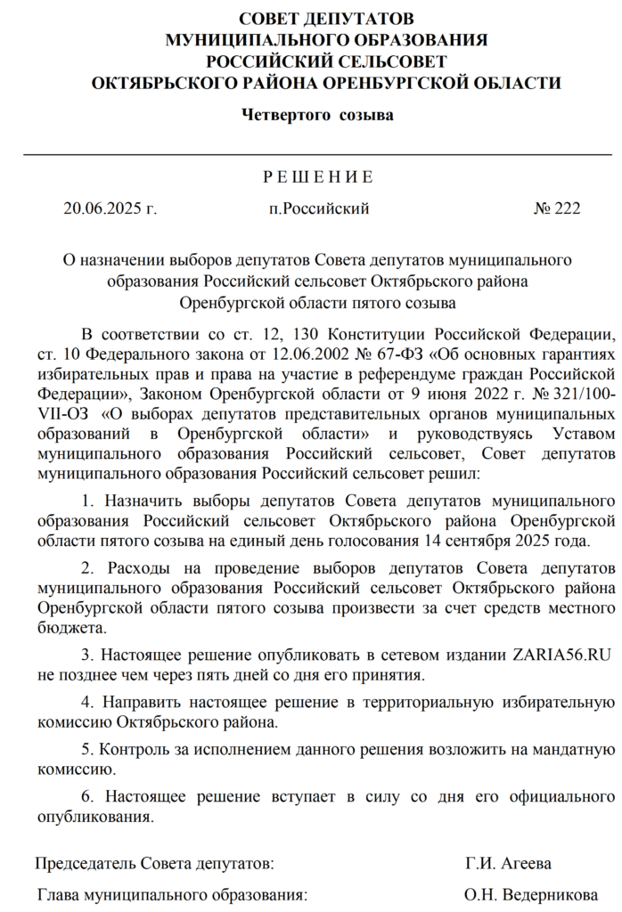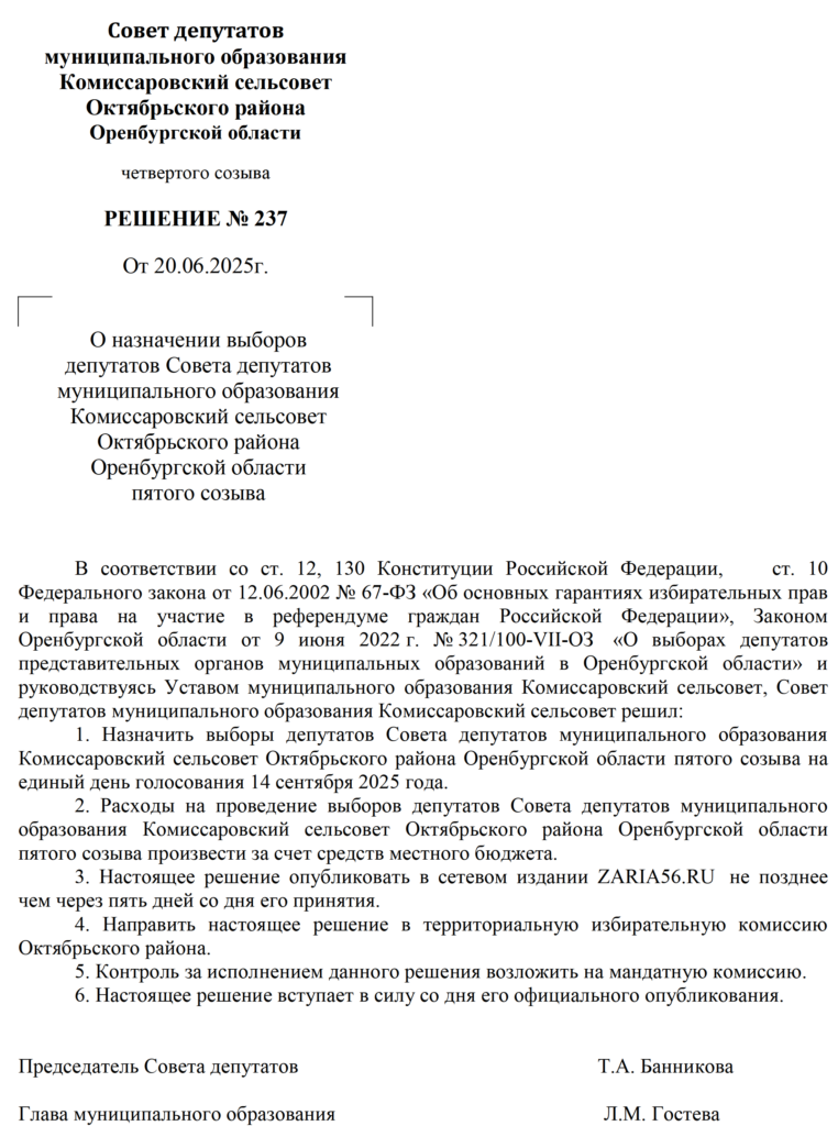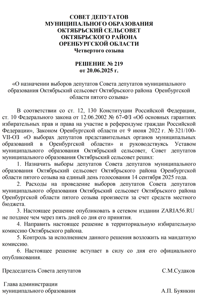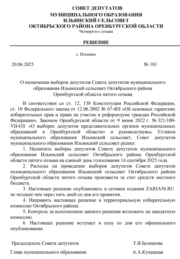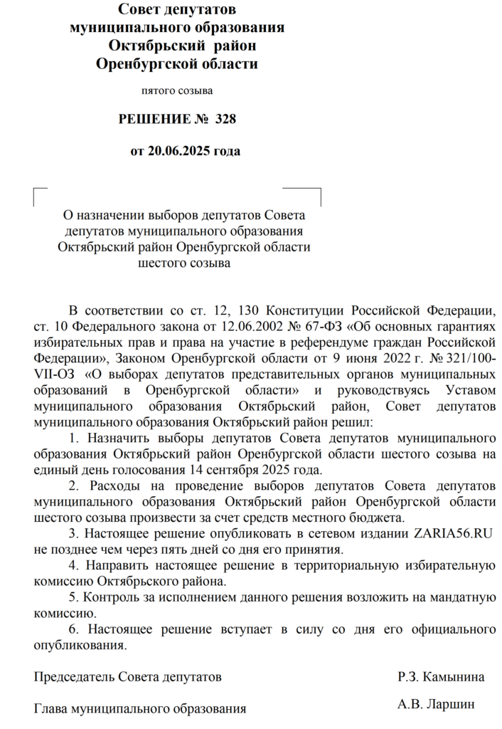 Решения Советов депутатов МО Октябрьский район и муниципальных образований сельских поселений о назначении выборов - Заря